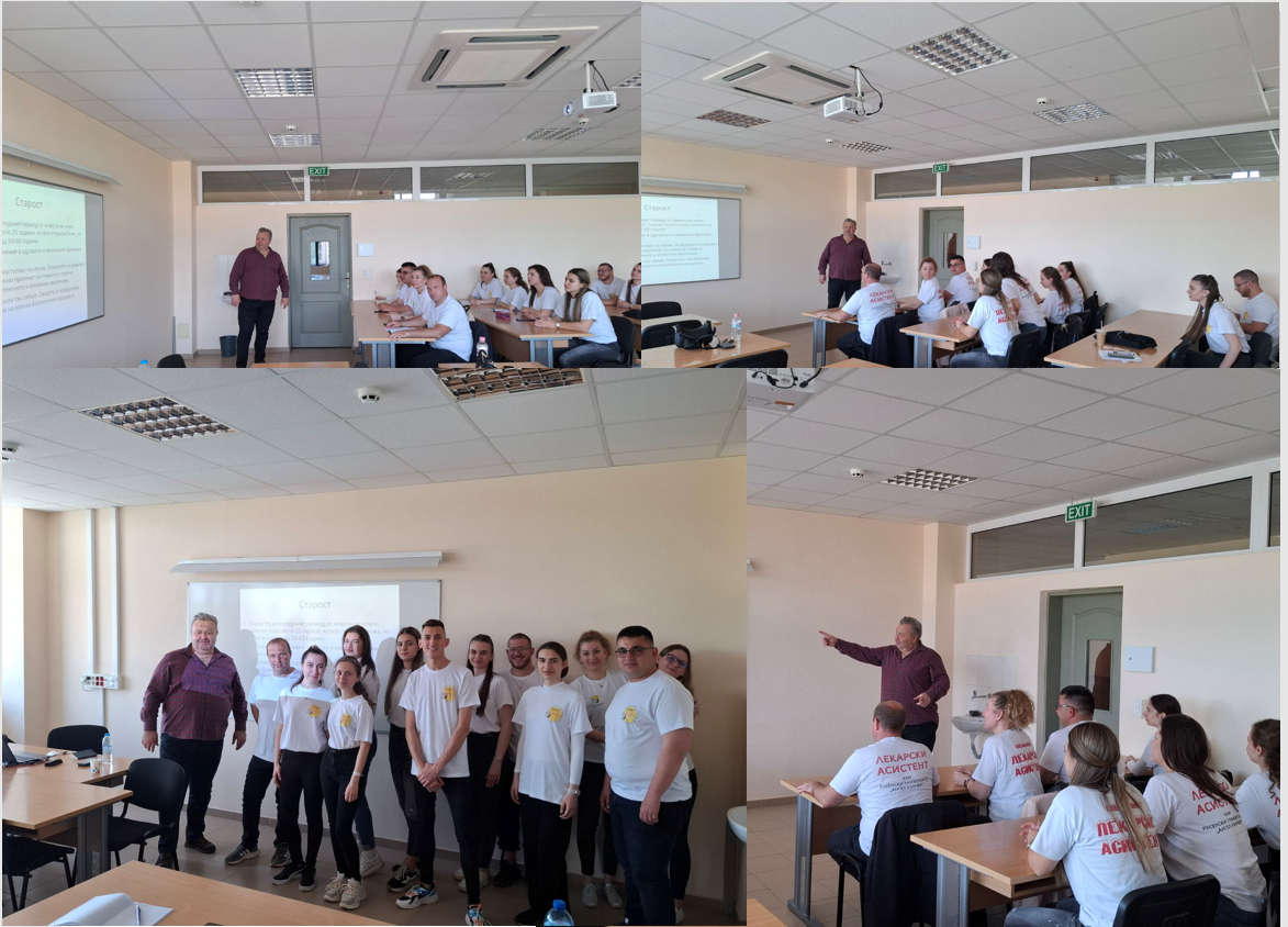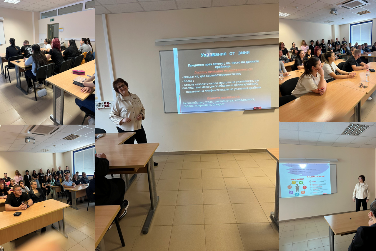 Доц. Теодора Недева представи темата, актуална за летния сезон -  "Поведение на лекарския асистент при ухапвания от насекоми и влечуги".Студентите от специалност Лекарски асистент, бяха подробно запознати с различните състояния, симптоми и поведение, особено в условията на първичната медицинска помощ.